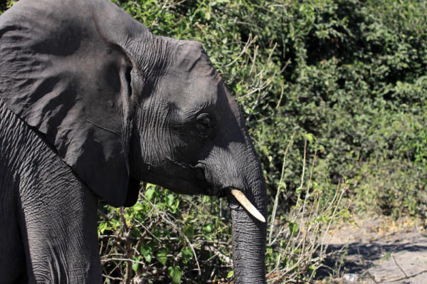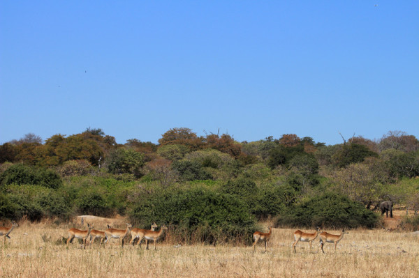 Zwischen der Serondela Picknick Site und dem Waldrand grast eine große Letschwe Familie. Einige Elefantenbullen treiben sich auch hier rum. Wir nutzen die Gelegenheit und suchen die Toiletten auf und vertreten uns ein wenig die Füße bevor wir weiter in Richtung Ihaha Campsite fahren.