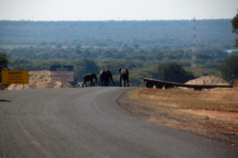 Kurz vor Kazungula wurden wir vom Botswana Road Block aufgehalten. Unglaublich wie unbekümmert die Elefantenkühe mit ihren jungen Kälbern hier die Straße kreuzen bzw. auch in aller Seelenruhe auf dem seitlichen Grünstreifen neben der A33 grasten.