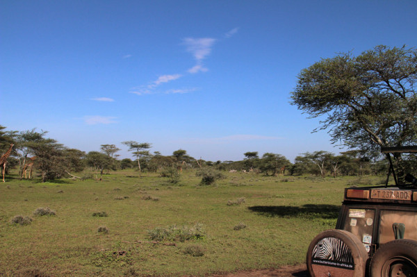 Gegen 09:00 Uhr war dann unser Gepäck in den Wagen verstaut und wir machten uns auf den Weg Richtung Serengeti. Eine große Gruppe Giraffen sah ausgesprochen hübsch in der lieblichen Landschaft aus, während die Wege immer noch sehr aufgeweicht und matschig waren. Auch wir mussten uns eine geeignete Pad suchen.