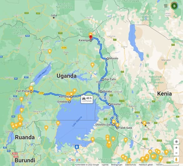 Landweg mit eigenem Fahrzeug und einem ugandischen Fahrer von Pamoja Safaris, bzw. in Fort Portal mit Toyota Van von Freunden.